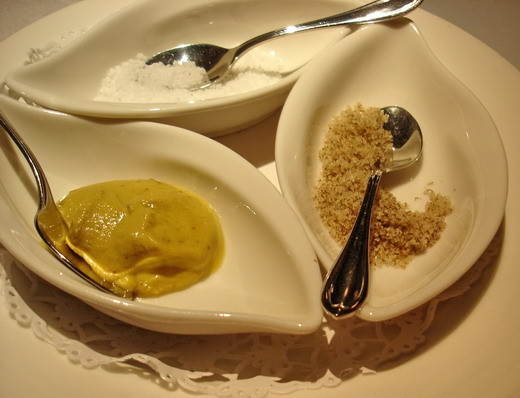 有岩鹽、茶末和牛菌菇三種調料味可以沾著牛排吃