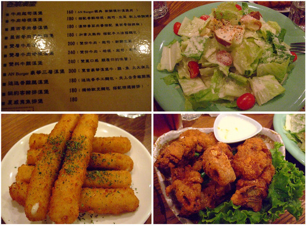 右上:生菜沙拉、右下:凱薩雞柳條、左下:紐奧良起司條